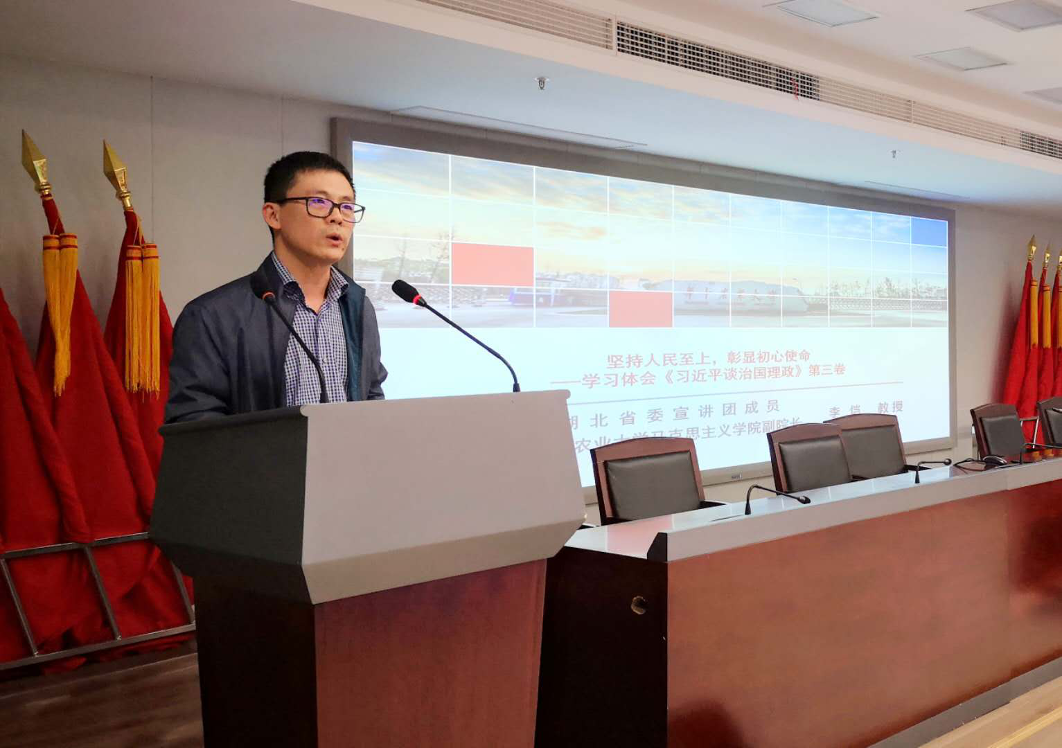 为深入贯彻学习习近平新时代中国特色社会主义思想,10月14日下午,公积金中心邀请湖北省委宣讲团成员、华中农业大学马克思主义学院李恺教授到中心作《习近平谈治国理政》第三卷宣讲。会议由中心党组书记、主任张灼主持,中心系统全体党员、副处级以上干部参加会议。