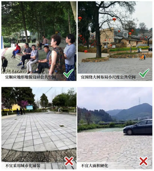 延续原有村落依山、靠林、面水的空间格局;尊重场地高差变化,形成“错台组团、街巷里坊”的平面布局,提倡三级街巷连通,避免“兵营式、排排坐”;营造公共空间,完善公服设施,传承民俗文化,留住乡愁记忆;还原乡野气息,鼓励宅前屋后栽种瓜果梨桃,构建“桃花红、李花白、菜花黄”的自然景观,营造“莺儿啼、燕儿舞、蝶儿忙”的乡村生境。