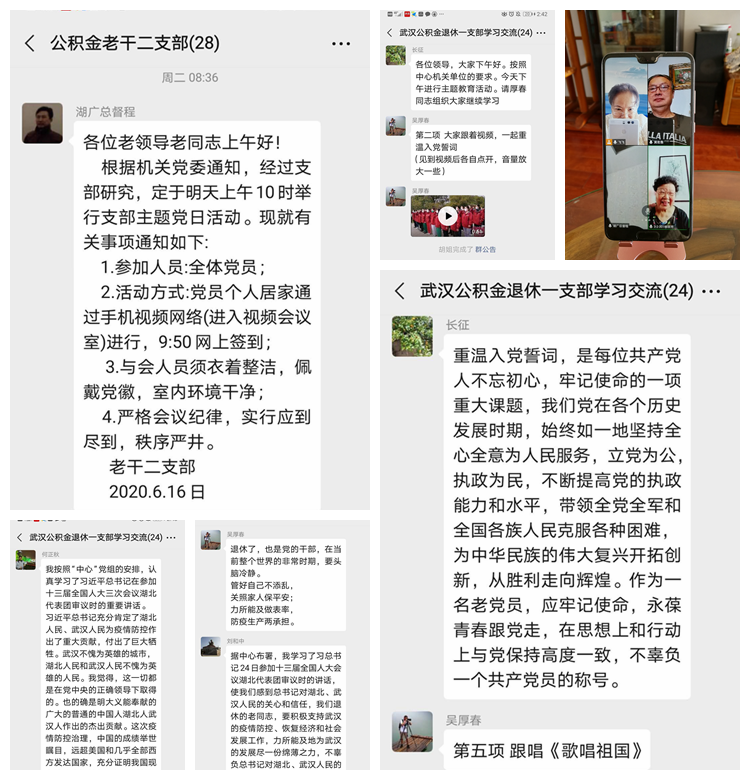 6月16日,武汉住房公积金管理中心两个老干党支部分别以腾讯会议和微信直播的形式开展“云上”六月份支部主题党日活动。