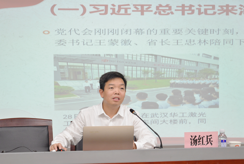宣讲会上,汤红兵教授以“建设先行区 奋进新征程”为主题,从“跟进一个核心、梳理一个思路、把握几个重点、做到几个结合”四个层次,图文并茂的对“学习贯彻习近平总书记考察湖北武汉重要讲话精神,推进落实省第十二次党代会决策部署”进行了深入解读,主题鲜明、重点突出,内涵丰富,切实把习近平总书记考察湖北武汉重要讲话精神和省第十二次党代会精神讲深讲透,进一步凝聚思想共识,汇聚奋进力量。