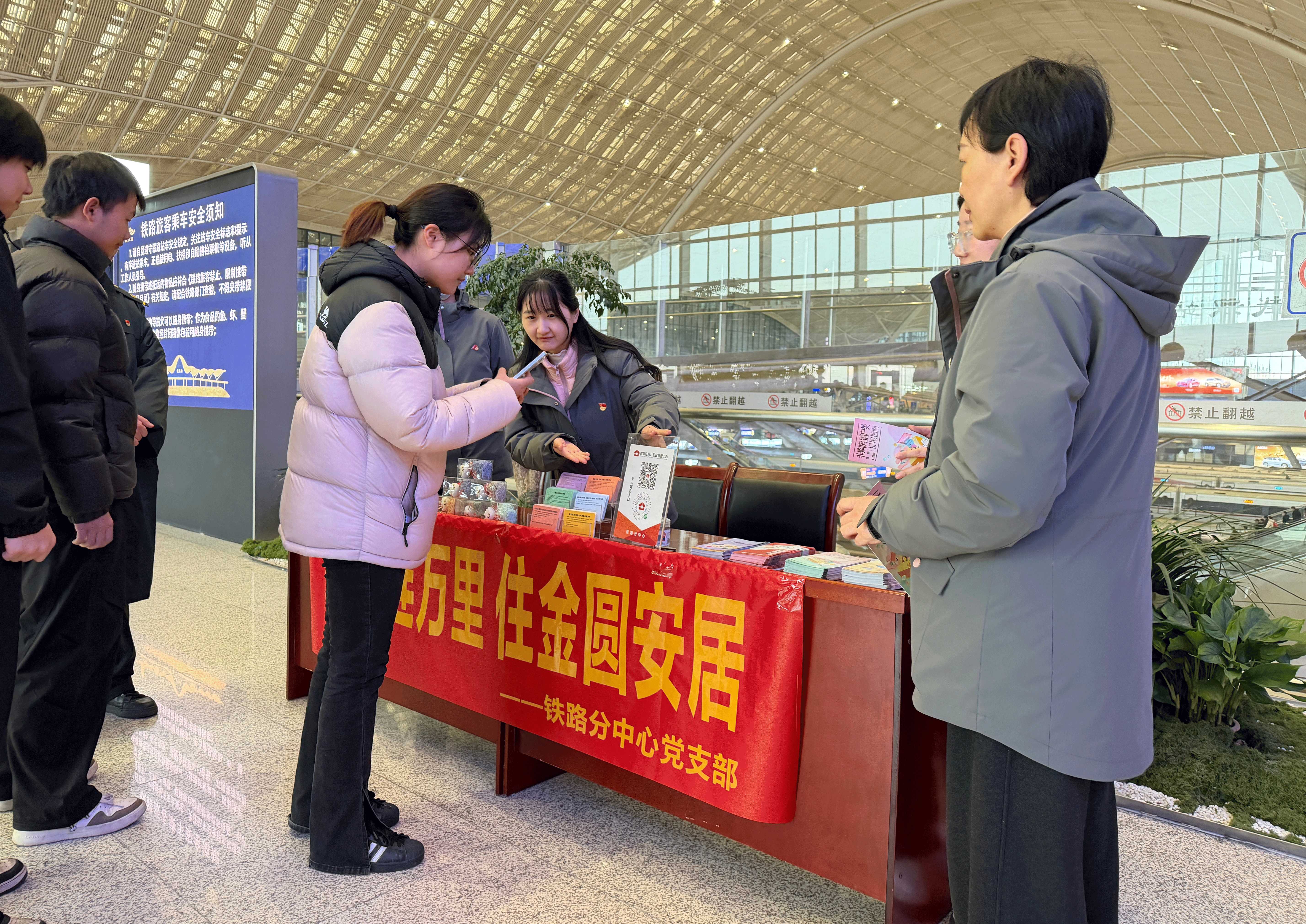 “春运候车传惠政,住金便民暖归程。”岁末年初,春运大幕拉开,万千游子踏上归乡之路。近日,铁路分中心以党建为引领,深化“铁路连万里,住金圆安居”党建子品牌建设,携手武汉车站开展公积金政策宣传活动,将服务窗口“搬”进武汉站候车大厅,为在汉务工返乡旅客送上直达心坎的便民服务,让党建红成为春运路上最亮眼的底色,让公积金的温暖护航每一段归家旅途。