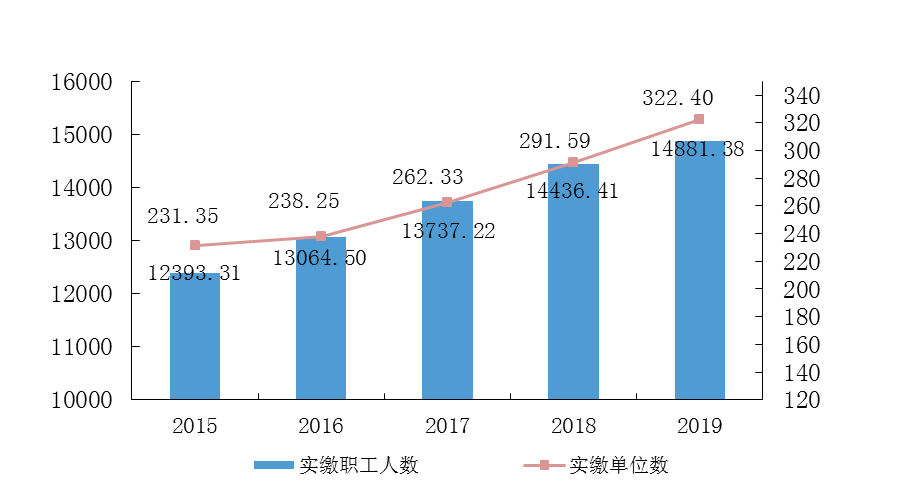 图4 2015—2019年实缴单位数和实缴职工人数