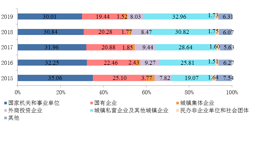 图5 2015—2019年按单位性质分缴存职工人数占比变化
