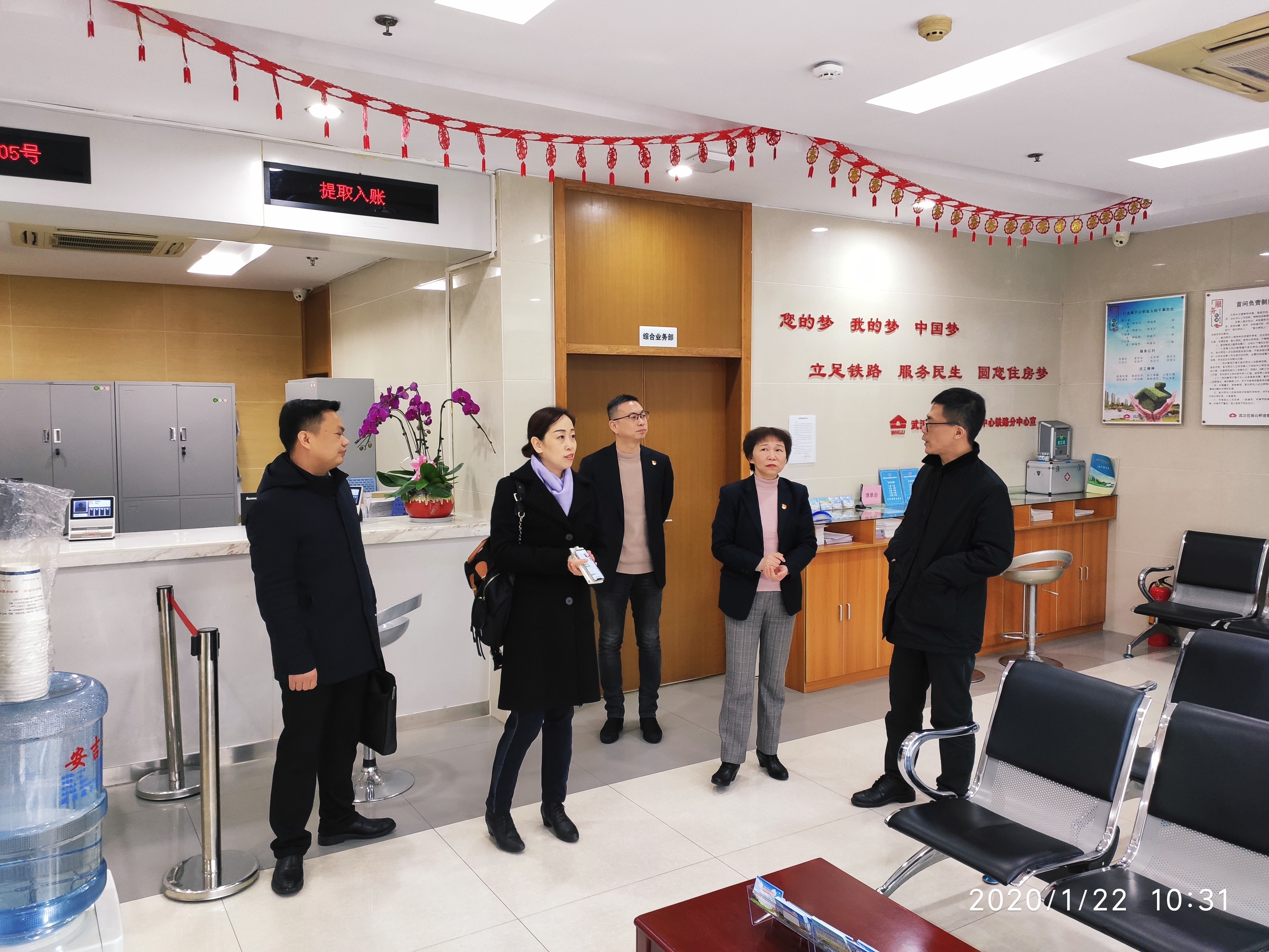 1月21-22日,武汉公积金中心集中开展节前检查工作。中心领导分别带队,先后分赴所属12个分中心和管理部,查看节前各项安全防范措施和服务大厅业务办理情况,看望仍然坚守在一线的前台柜员,为大家带去了防疫防护用品。