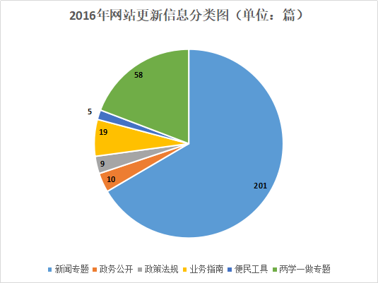 2016年,我们对网站进行了全面改版,分类更合理、界面更清晰,增强了可扩展性,基于网站管理后台,统一管理其他渠道内容更新。新增了场景服务、服务大厅和快速入口,添加了微信微博等平台二维码。新增政务页面的网上业务系统入口,单位用户和个人用户界面明晰,使用方便,安全性也较之前得到很大的提高。同时,按政府要求,新增“两学一做”、学习十八届六中全会精神等板块,做好相关宣传。同时,继续做好行政权力清单的梳理工作,在网站首页设置行政权力清单专栏,公布行政权力9项,接受社会各界监督。加大更新频率,目前早已超出“日均一条”的标准。