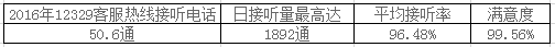 2016年12329客服热线接听电话50.6万通,日接听量最高达1892通,接听率96.48%,满意度达99.56%。
