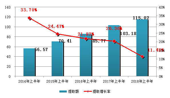 2018年上半年全市提取公积金115.02亿元,同比增长11.48%。截止2018年6月30日全市累计提取1,216.97亿元。
