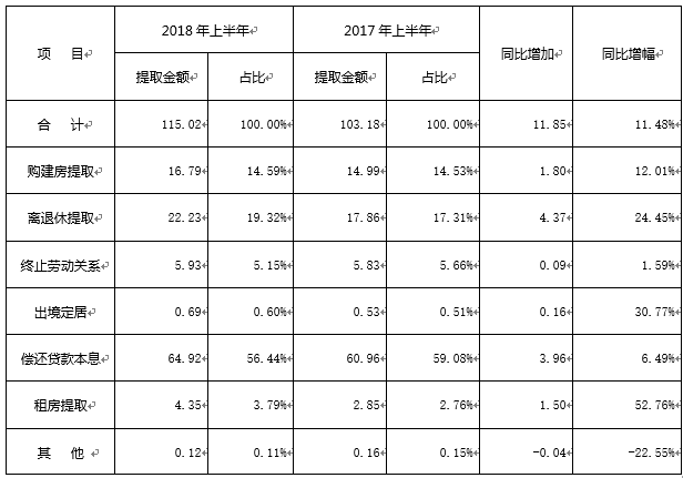 2018年上半年,公积金提取115.02亿元,同比增加11.85亿元、增幅11.48%,同比增加金额、增幅与去年同期相比有所减少、下降。其中:住房消费类提取86.06亿元,占提取额的74.82%,较去年同期相比,占比下降1.55个百分点。