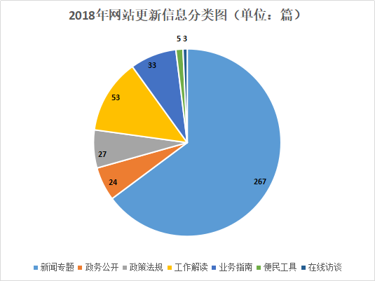 2018年,网站累计更新各类信息412条。其中新闻专题栏目267篇(含中心要闻116篇、业内新闻36篇、中心风采4篇、分中心动态50篇、最新公告39篇、机关党建22篇),政务公开栏目24篇,政策法规27篇,工作解读53篇,业务指南栏目33篇,便民工具栏5篇,在线访谈3篇。