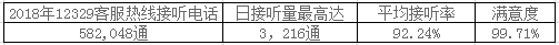 2018年12329客服热线接听电话582,048通,日接听量最高达3,216通,平均接听率92.24%,满意度达99.71%。