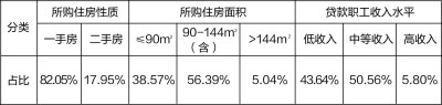 职工贷款所购住房套数中,90(含)以下占38.57%,90-144(含)占56.39%,144以上占5.04%;一手房占82.05%,二手房占17.95%。